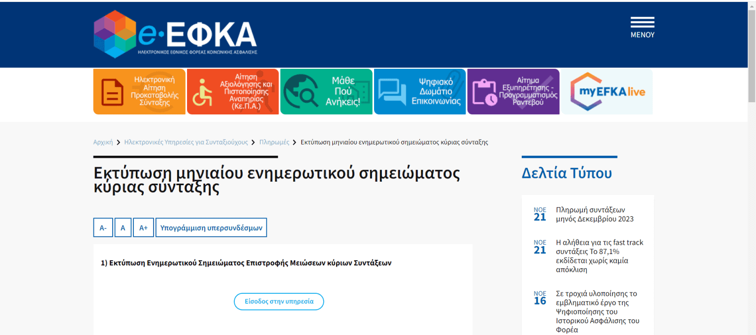 Εξατομικευμένη πρόσβαση στο ενημερωτικό σημείωμα κάθε δικαιούχου, μπορεί να αποκτηθεί με είσοδο (με χρήση των προσωπικών κωδικών TAXISNET) στην ηλεκτρονική πλατφόρμα e–EFKA κάνοντας κλικ ΕΔΩ: