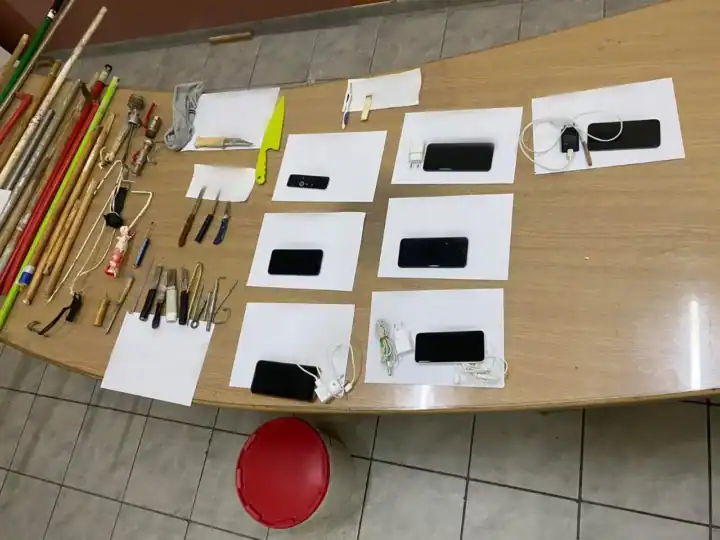 Συγκεκριμένα, κατασχέθηκαν 6 κινητά τηλέφωνα, handsfree ακουστικά, 4 φορτιστές κινητών τηλεφώνων, 1 χειριστήριο TV BOX, 1 θήκη κινητού τηλεφώνου, 8 αυτοσχέδια μαχαίρια, 2 μαχαίρια εμπορίου, 1 πλαστικό μαχαίρι εμπορίου, 3 αυτοσχέδια σουβλιά, 1 μεταλλικό σουβλί και 16 κοντάρια.