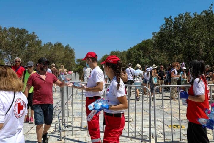 Την Παρασκευή (2/8), ημέρα κατά την οποία αναμένονται οι υψηλότερες θερμοκρασίες, θα πραγματοποιηθεί αντίστοιχη δράση στα εκδοτήρια της Ακρόπολης όπου θα στηθεί από τον Ε.Ε.Σ. Σταθμός Ενυδάτωσης και θα διανεμηθεί μεγάλη ποσότητα δωρεάν εμφιαλωμένων κρύων νερών στους επισκέπτες της Ακρόπολης.