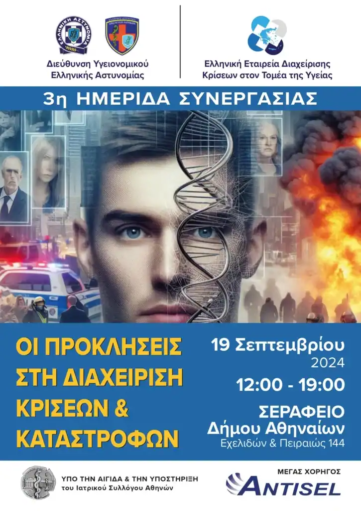 Η Διεύθυνση Υγειονομικού της Ελληνικής Αστυνομίας και η Ελληνική Εταιρεία Διαχείρισης Κρίσεων στον τομέα της Υγείας συνδιοργανώνουν την Πέμπτη 19 Σεπτεμβρίου 2024, στο Σεράφειο του Δήμου Αθηναίων (Εχελιδών & Πειραιώς 144), την 3η ημερίδα συνεργασίας: «Οι προκλήσεις στη διαχείριση κρίσεων και καταστροφών».
