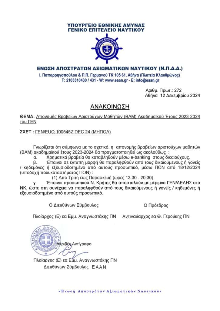 Ελλάδα Απονομή Βραβείων Αριστούχων Μαθητών (ΒΑΜ) Ακαδημαϊκού Έτους 2023-2024 του ΓΕΝ