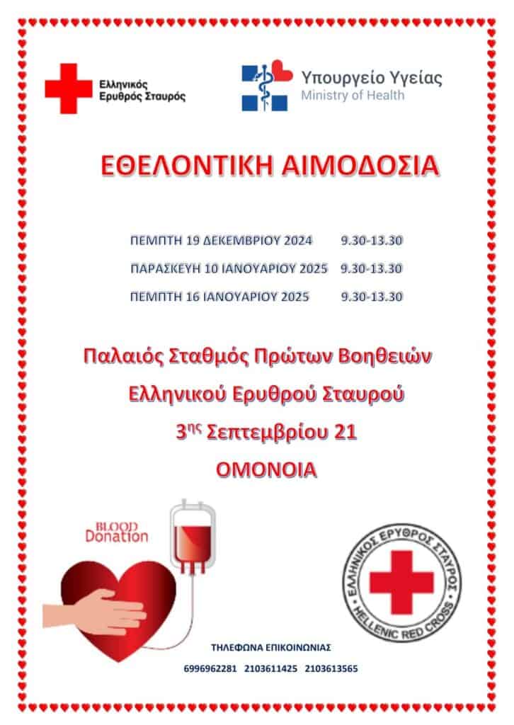 Ο Ελληνικός Ερυθρός Σταυρός (Ε.Ε.Σ.), σε συνεργασία με το Υπουργείο Υγείας, διοργανώνει τρεις εθελοντικές αιμοδοσίες το επόμενο διάστημα (19/12, 10/1 και 16/1), με σκοπό την ενίσχυση των εθνικών αποθεμάτων αίματος και την προώθηση της αλληλεγγύης προς τους συνανθρώπους μας που έχουν ανάγκη.