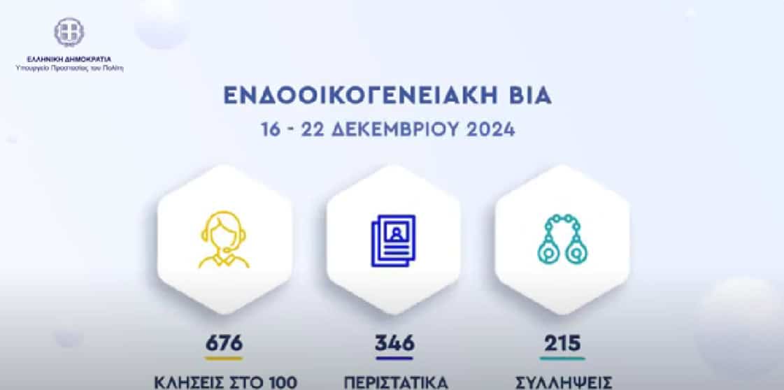 Ειδικότερα, την περασμένη εβδομάδα από 16 έως 22 Δεκεμβρίου 2024, για την αντιμετώπιση του φαινομένου της ενδοοικογενειακής βίας, δραστηριοποιήθηκαν οι υπηρεσίες της Ελληνικής Αστυνομίας, και ιδιαίτερα τα επιχειρησιακά Γραφεία Αντιμετώπισης Ενδοοικογενειακής Βίας, που επιλαμβάνονται στην πλειονότητα των περιστατικών.