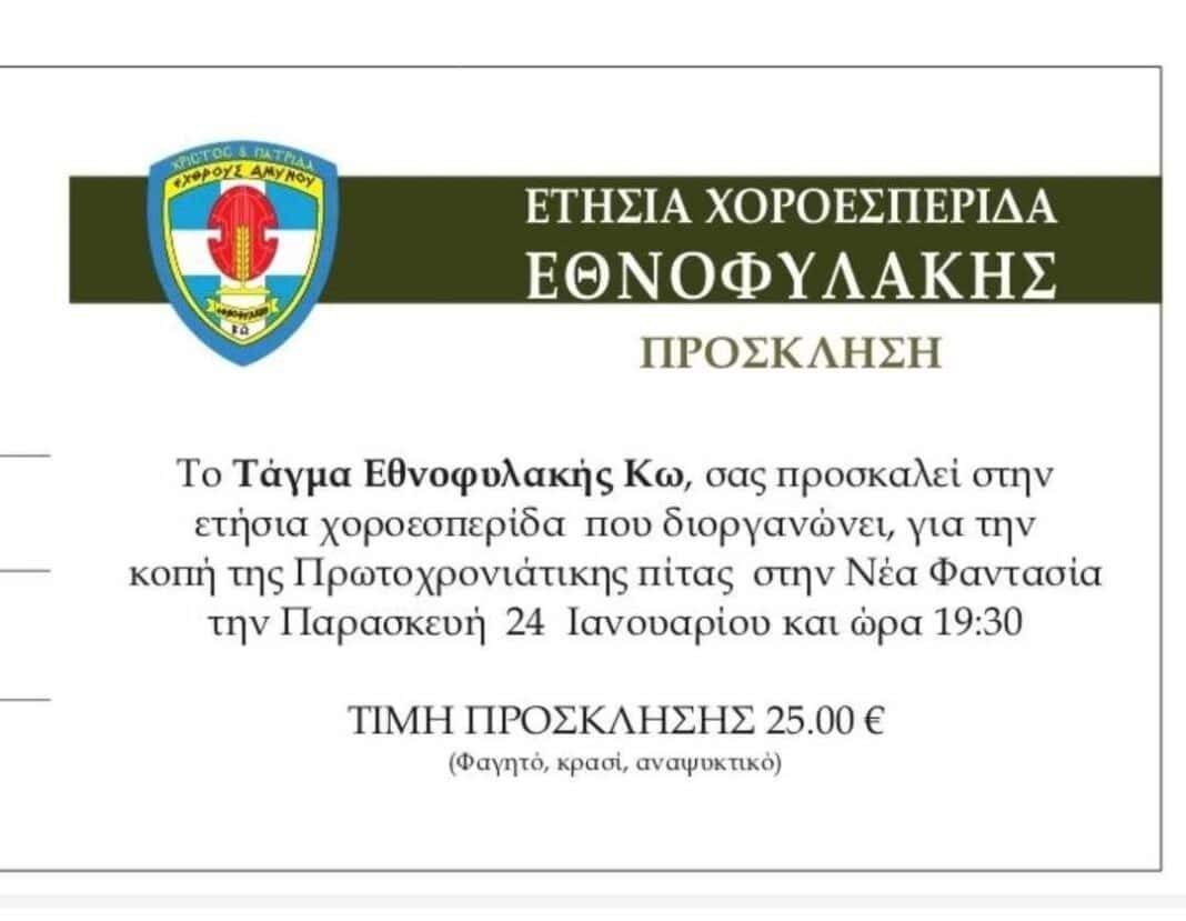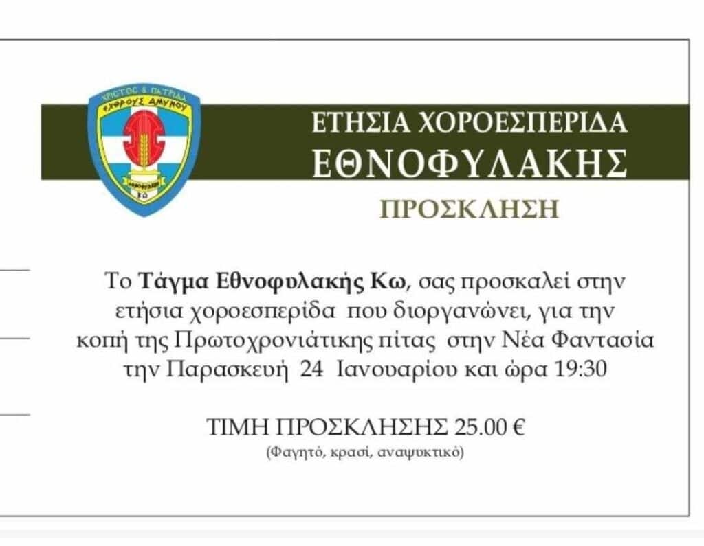 Οι Εθνοφύλακες Κω σας προσκαλούν στην ετήσια χοροεσπερίδα που διοργανώνουν για την κοπή της πρωτοχρονιάτικης πίττας την Παρασκευή 24 Ιανουαρίου στη Νέα Φαντασία στις 19.30.