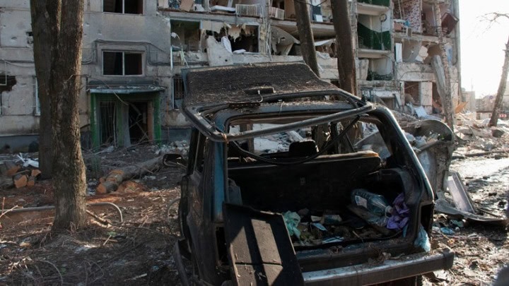 Σύμφωνα με τις φωτογραφίες, από τη ρωσική επίθεση επλήγη ένα μίνι βαν – ταξί, ένα τραμ και ένα πολυώροφο κτίριο όπου ξέσπασε πυρκαγιά.