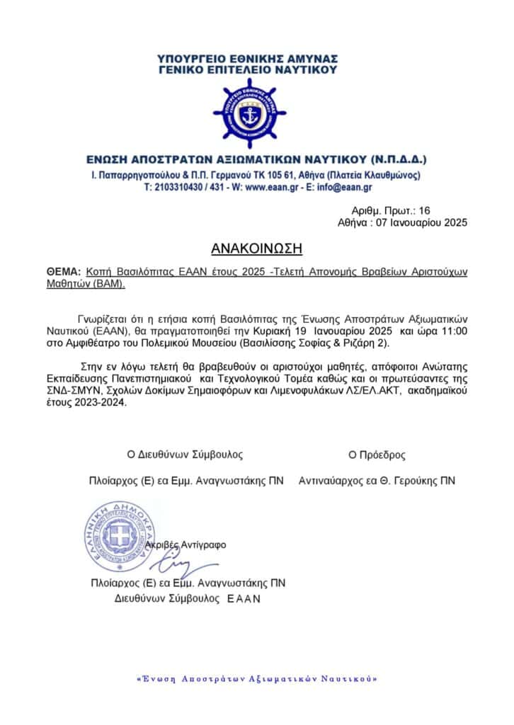 Ελλάδα Κοπή Πίτας ΕΑΑΝ 2025-Τελετή Απονομής Βραβείων Αριστούχων Μαθητών (ΒΑΜ)