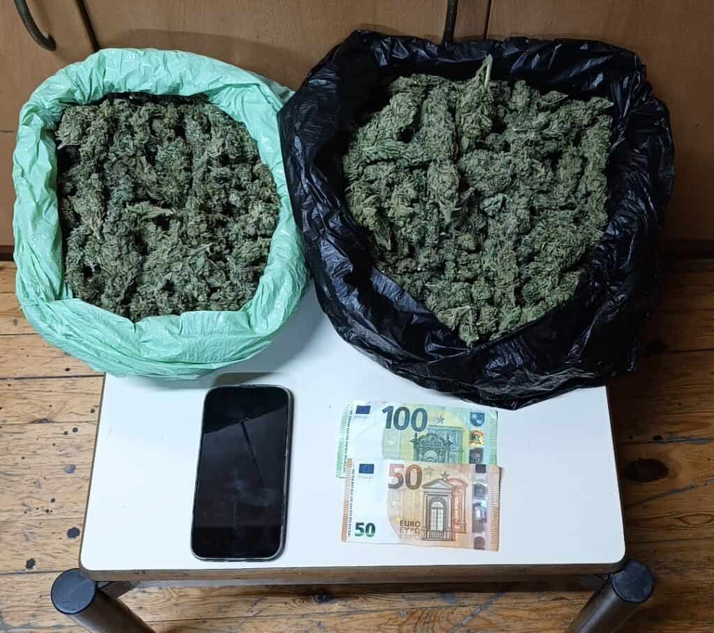 Κατά τη διάρκεια του ελέγχου βρέθηκαν και κατασχέθηκαν 1.047 γραμμάρια κάνναβης, το χρηματικό ποσό των 150 ευρώ ως προερχόμενο από παράνομες δραστηριότητες και κινητό τηλέφωνο.