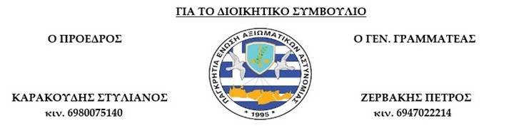 Η Ένωση Αξιωματικών ΕΛ.ΑΣ. Περιφέρειας Κρήτης πραγματοποίησε την Τετάρτη 22 Ιανουαρίου 2025 εθιμοτυπική συνάντηση με τον Γενικό Αστυνομικό Διευθυντή Περιφέρειας Κρήτης Υποστράτηγο κ. Σπυριδάκη Νικόλαο καθώς και με το νέο Αστυνομικό Διευθυντή Χανίων Ταξίαρχο κ. Νικολάου Κανέλλου, εκφράζοντας τα συγχαρητήρια μας στον μεν Στρατηγό για την παραμονή του για δεύτερη χρονιά στο τιμόνι της ΓΕ.Π.Α.Δ. Κρήτης, στο δε κ. Νικολάου για την προαγωγή του στο βαθμό του Ταξίαρχου στις πρόσφατες κρίσεις του σώματος αλλά και για την ανάληψη των καθηκόντων ως επικεφαλής της Διεύθυνσης Αστυνομίας Χανίων, με την ευχή να έχουν μία εποικοδομητική και άκρως αποτελεσματική χρονιά με πολλές επιτυχίες στην πάταξη του εγκλήματος για την εμπέδωση του αισθήματος ασφάλειας στους πολίτες του Νησιού μας.