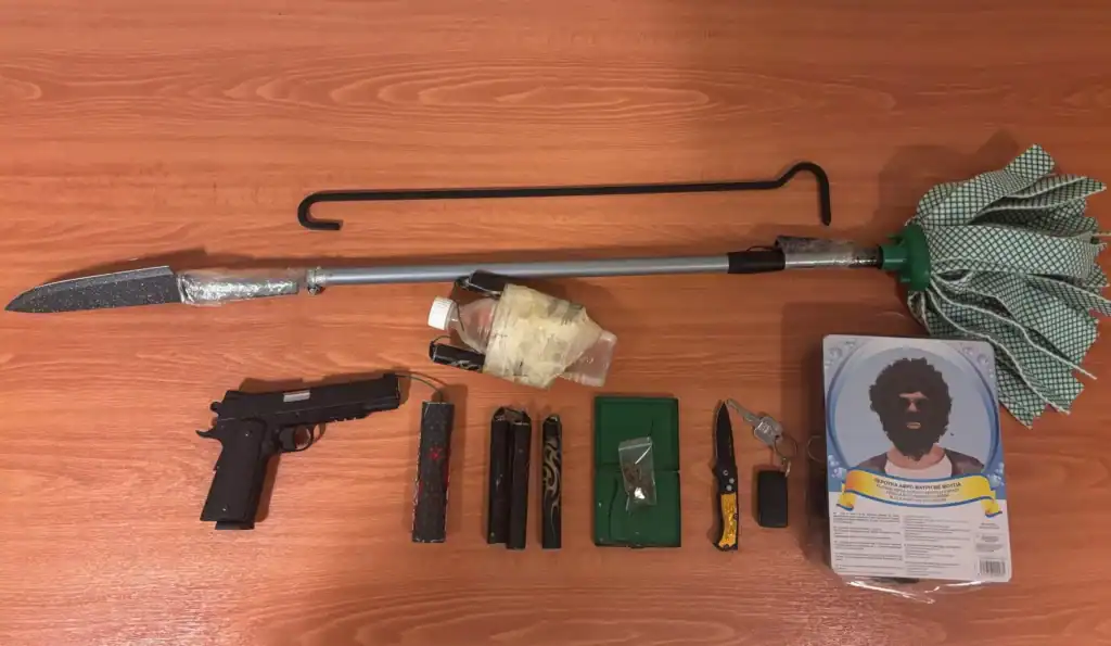 - αυτοσχέδια κατασκευή αποτελούμενη από σφουγγαρίστρα, στην άκρη της οποίας είχε τοποθετήσει μαχαίρι με κολλητική ταινία και στην άλλη άκρη κροτίδα,