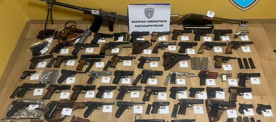 Κατόπιν έρευνας στο σκάφος του, βρέθηκαν εξήντα ένα (61) όπλα διαφόρων διαμετρημάτων και τύπων (όπλα χειρός, πιστόλια, περίστροφα, σιγαστήρες κλπ) με διάφορα παρελκόμενα καθώς και δύο χιλιάδες εννιακόσια δεκαέξι (2.916) φυσίγγια διαφόρων διαμετρημάτων και τύπων, κατάλληλων και για πολεμική χρήση.