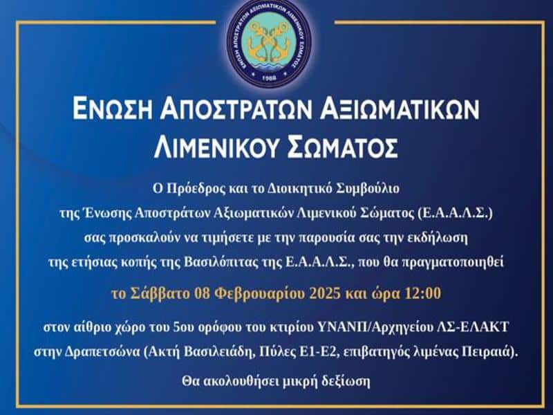 Το Σάββατο 8 Φεβρουαρίου 2025, στις 1200 στον αίθριο χώρο του 5ου ορόφου του κτιρίου ΥΝΑΝΠ/ Αρχηγείο ΛΣ-ΕΛ.ΑΚΤ. θα πραγματοποιηθεί η εκδήλωση της ετήσιας κοπής της Βασιλόπιτας της Ένωσης Αποστράτων Αξιωματικών Λιμενικού Σώματος παρουσία της πολιτικής και στρατιωτικής ηγεσίας του Λιμενικού Σώματος. Η παρουσία σας θα μας τιμήσει ιδιαίτερα.