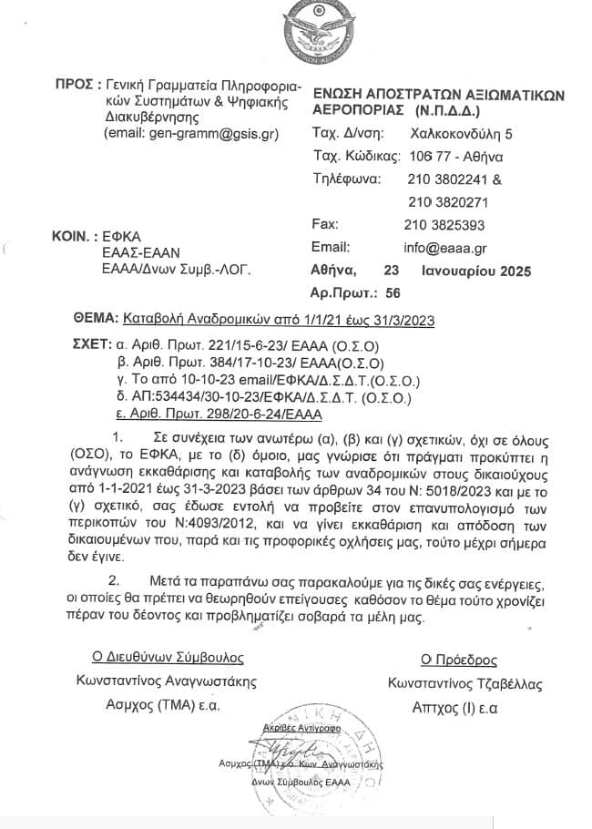 Ελλάδα Επιστολή ΕΑΑΑ σε ΓΓΠΣ & ΨΔ-Καταβολή Αναδρομικών από 1/1/21 έως 31/3/23 Ελλάδα Επιστολή ΕΑΑΑ σε ΓΓΠΣ & ΨΔ-Καταβολή Αναδρομικών από 1/1/21 έως 31/3/23 10/02/2025 FacebookTwitterWhatsAppEmailΤυπώνωTelegramViber ΣΤΗΝ ΙΔΙΑ ΚΑΤΗΓΟΡΙΑΠΕΡΙΣΣΟΤΕΡΑ... Ελλάδα Μακεδονία: Νεαρός άνδρας οδηγούσε τα ξημερώματα με 179χλμ/ώρα και συνελήφθη Ελλάδα Χανιά: Δέκα συλλήψεις μετά από καταγγελία ανήλικης για ομαδικό βιασμό Ελλάδα Διακινητής μετέφερε οκτώ μετανάστες στο ρυμουλκούμενο του οχήματός του ΔΙΑΒΑΣΤΕ ΕΠΙΣΗΣ Πρώτες βοήθειες σε τροχαία ατυχήματα 17/03/2026 Λασίθι: Με τρία νέα οχήματα ενισχύεται το Λιμεναρχείο Αγίου Νικολάου –... 16/03/2026 Μακεδονία: Νεαρός άνδρας οδηγούσε τα ξημερώματα με 179χλμ/ώρα και συνελήφθη 16/03/2026 FT: Υπουργοί της ΕΕ θα συζητήσουν τη διεύρυνση της αποστολής «Ασπίδες»... 16/03/2026 Χανιά: Δέκα συλλήψεις μετά από καταγγελία ανήλικης για ομαδικό βιασμό 16/03/2026 Β. Κικίλιας: «Θα κάνουμε ό,τι μπορούμε για τους Έλληνες ως προς... 16/03/2026 Διακινητής μετέφερε οκτώ μετανάστες στο ρυμουλκούμενο του οχήματός του 16/03/2026 Δολοφονία 20χρονου στην Καλαμαριά – Συμπληρωματική δίωξη στα δύο άτομα που... 16/03/2026 Νεκρός εντοπίστηκε αγνοούμενος ηλικιωμένος ψαράς, σε βραχώδη περιοχή κοντά στη Λίνδο 16/03/2026 Πυροσβέστες Νομού Ηρακλείου: Συνάντηση αντιπροσωπείας 8 συνεργαζόμενων Σωματείων με τον Αντιστράτηγο... 16/03/2026
