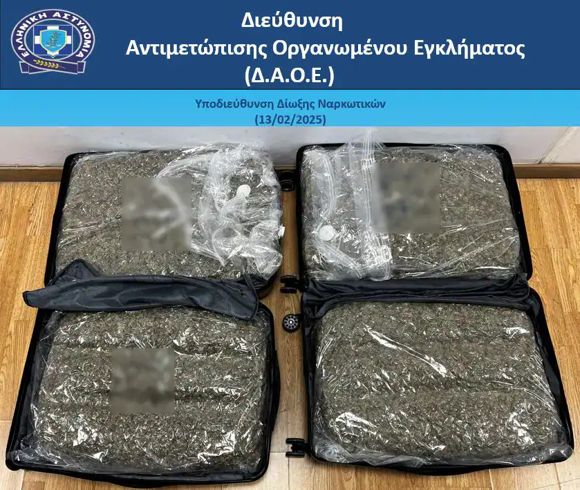 Από την Υποδιεύθυνση Δίωξης Ναρκωτικών, της Διεύθυνσης Αντιμετώπισης Οργανωμένου Εγκλήματος, συνελήφθη απογευματινές ώρες την Πέμπτη 13 Φεβρουαρίου 2025, στο αεροδρόμιο «Ελευθέριος Βενιζέλος» της Αθήνας, γυναίκα, η οποία κατείχε μεγάλη ποσότητα ακατέργαστης κάνναβης.