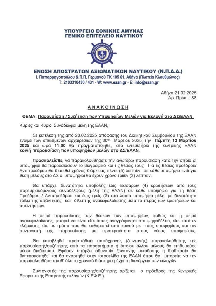 Ελλάδα Παρουσίαση / Συζήτηση των Υποψηφίων Μελών για Εκλογή στο ΔΣ/ΕΑΑΝ Ελλάδα Παρουσίαση / Συζήτηση των Υποψηφίων Μελών για Εκλογή στο ΔΣ/ΕΑΑΝ 22/02/2025 FacebookTwitterWhatsAppEmailΤυπώνωTelegramViber ΣΤΗΝ ΙΔΙΑ ΚΑΤΗΓΟΡΙΑΠΕΡΙΣΣΟΤΕΡΑ... Ελλάδα Μακεδονία: Νεαρός άνδρας οδηγούσε τα ξημερώματα με 179χλμ/ώρα και συνελήφθη Ελλάδα Χανιά: Δέκα συλλήψεις μετά από καταγγελία ανήλικης για ομαδικό βιασμό Ελλάδα Διακινητής μετέφερε οκτώ μετανάστες στο ρυμουλκούμενο του οχήματός του ΔΙΑΒΑΣΤΕ ΕΠΙΣΗΣ Πρώτες βοήθειες σε τροχαία ατυχήματα 17/03/2026 Λασίθι: Με τρία νέα οχήματα ενισχύεται το Λιμεναρχείο Αγίου Νικολάου –... 16/03/2026 Μακεδονία: Νεαρός άνδρας οδηγούσε τα ξημερώματα με 179χλμ/ώρα και συνελήφθη 16/03/2026 FT: Υπουργοί της ΕΕ θα συζητήσουν τη διεύρυνση της αποστολής «Ασπίδες»... 16/03/2026 Χανιά: Δέκα συλλήψεις μετά από καταγγελία ανήλικης για ομαδικό βιασμό 16/03/2026 Β. Κικίλιας: «Θα κάνουμε ό,τι μπορούμε για τους Έλληνες ως προς... 16/03/2026 Διακινητής μετέφερε οκτώ μετανάστες στο ρυμουλκούμενο του οχήματός του 16/03/2026 Δολοφονία 20χρονου στην Καλαμαριά – Συμπληρωματική δίωξη στα δύο άτομα που... 16/03/2026 Νεκρός εντοπίστηκε αγνοούμενος ηλικιωμένος ψαράς, σε βραχώδη περιοχή κοντά στη Λίνδο 16/03/2026 Πυροσβέστες Νομού Ηρακλείου: Συνάντηση αντιπροσωπείας 8 συνεργαζόμενων Σωματείων με τον Αντιστράτηγο... 16/03/2026