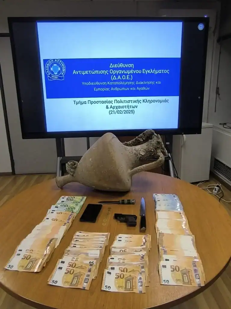 Από την Υποδιεύθυνση Καταπολέμησης Διακίνησης και Εμπορίας Ανθρώπων και Αγαθών της Διεύθυνσης Αντιμετώπισης Οργανωμένου Εγκλήματος συνελήφθη στο πλαίσιο της αυτόφωρης διαδικασίας, πρωινές ώρες της Παρασκευής (21/02/2025), σε περιοχή της Αθήνας, άνδρας (ημεδαπός), σε βάρος του οποίου σχηματίστηκε δικογραφία για παράβαση της νομοθεσίας για την προστασία των αρχαιοτήτων και εν γένει της πολιτιστικής κληρονομιάς, περί όπλων, καθώς και περί φωτοβολίδων και πυροτεχνημάτων.