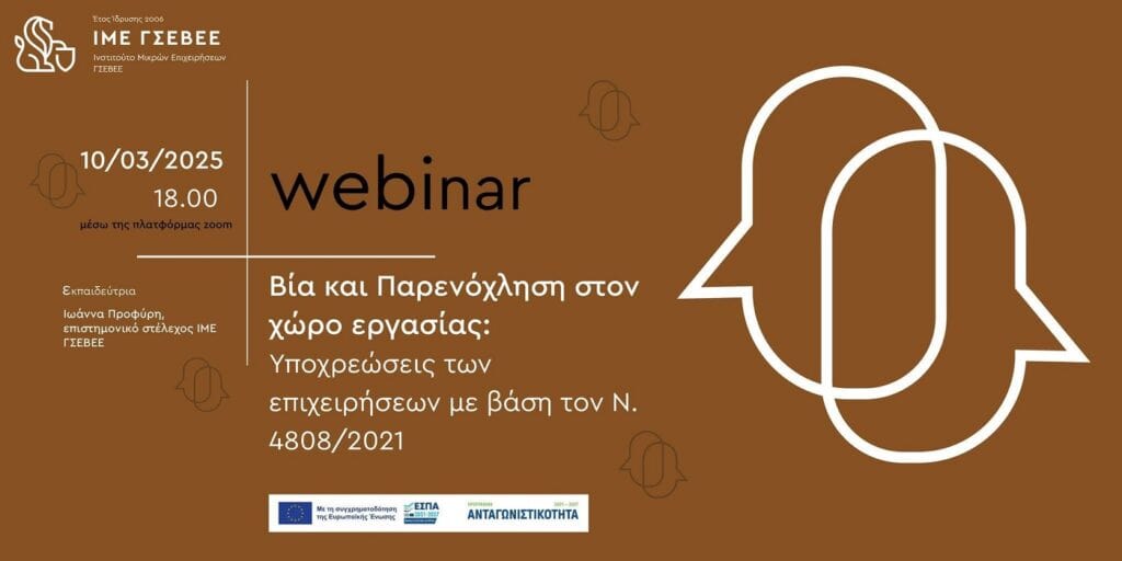 Διαδικτυακό σεμινάριο με θέμα: «Βία και παρενόχληση στον χώρο εργασίας: Υποχρεώσεις των επιχειρήσεων με βάση τον Ν. 4808/2021» διοργανώνει το Ινστιτούτο Μικρομεσαίων της Γενικής Συνομοσπονδίας Επαγγελματιών Βιοτεχνών Εμπόρων Ελλάδος (ΙΜΕ ΓΣΕΒΕΕ) στις 10 Μαρτίου.