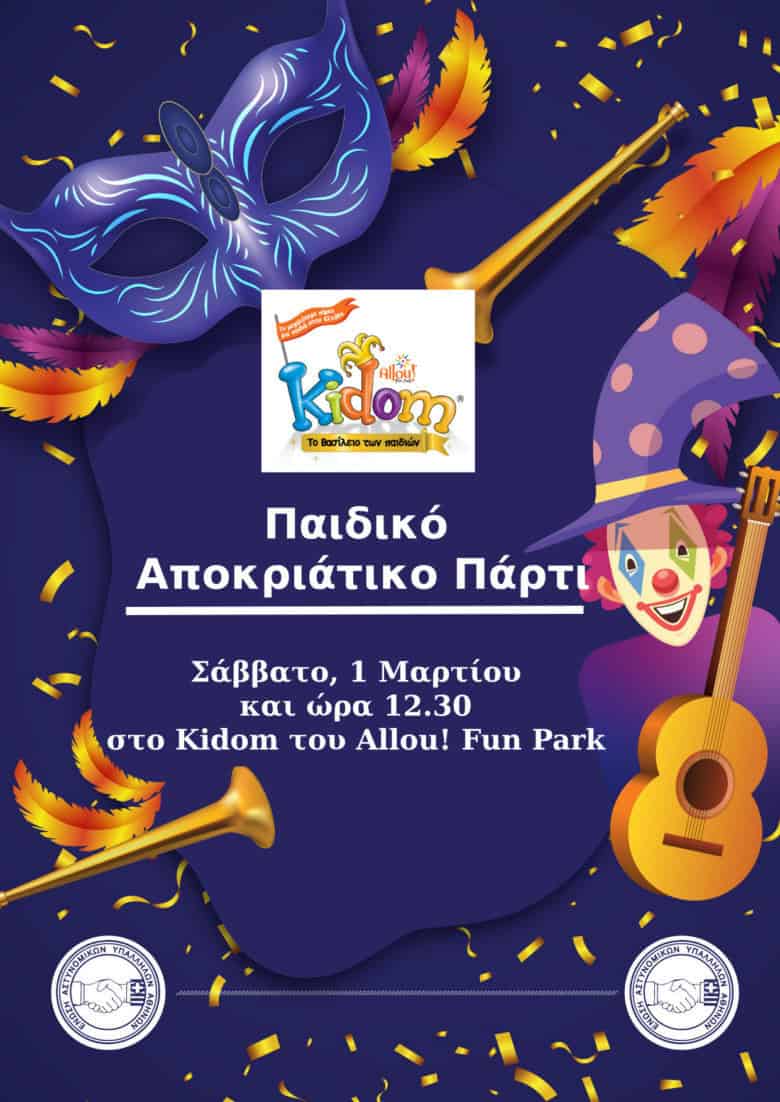 Η Ένωση Αστυνομικών Υπαλλήλων Αθηνών διοργανώνει το Σάββατο 1 Μαρτίου 2025 και ώρα 12:30 Αποκριάτικο παιδικό πάρτι για τα παιδιά των μελών μας έως 12 ετών στο Kidom του Allou! Fun Park, στη συμβολή των οδών Λ. Κηφισσού & Πέτρου Ράλλη, Άγ. Ιωάννης Ρέντης.