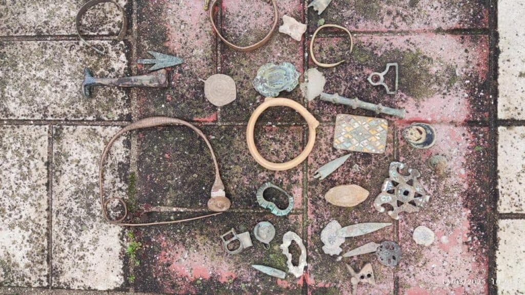 - χιλιάδες νομίσματα (χρυσά, χάλκινα και ασημένια διαφόρων περιόδων) και μεταλλικά αντικείμενα μικρών διαστάσεων, μεταξύ άλλων, μολύβδινοι πεσσοί σφενδόνης, χάλκινες πόρπες, αιχμές βελών, τμήματα βάσεων αγγείων,