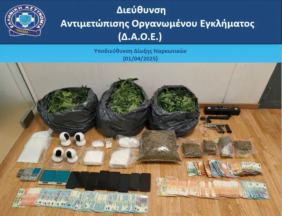 Επίσης, κατασχέθηκαν περισσότερα από 1.000 δενδρύλλια κάνναβης υδροπονικής καλλιέργειας, 13 κιλά φύλλα κάνναβης, 1,8 κιλά ακατέργαστης κάνναβης, 3 κιλά κοκαΐνης, πιστόλι κρότου και Ι.Χ.Ε. αυτοκίνητα