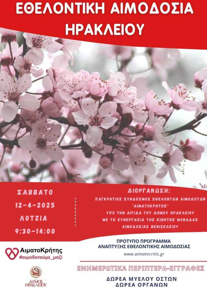 Το Σάββατο 12 Απριλίου 2025 θα πραγματοποιηθεί εθελοντική αιμοδοσία στο κέντρο της πόλης του Ηρακλείου και συγκεκριμένα στο αίθριο της Λότζια από τις 09:30 έως τις 14:00.