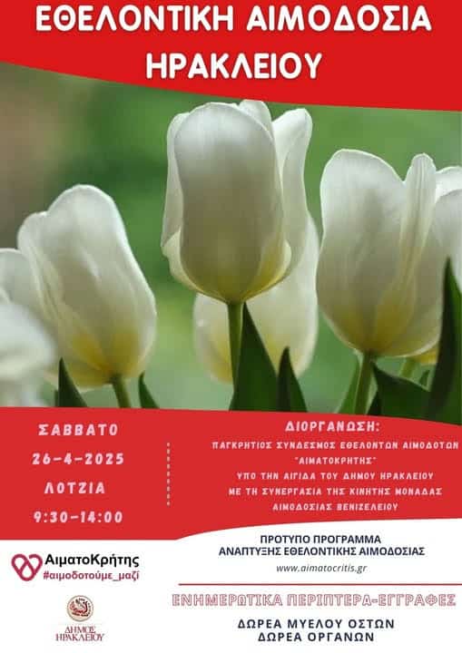 Το Σάββατο 26 Απριλίου 2025 θα πραγματοποιηθεί εθελοντική αιμοδοσία στο κέντρο της πόλης του Ηρακλείου και συγκεκριμένα στο αίθριο της Λότζια από τις 09:30 έως τις 14:00.