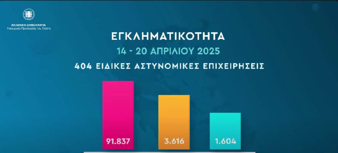 Πιο αναλυτικά, κατά τη διάρκεια των δράσεων για την καταπολέμηση της εγκληματικότητας σε ολόκληρη τη χώρα, από 14 έως 20 Απριλίου 2025, πραγματοποιήθηκαν 404 ειδικές αστυνομικές επιχειρήσεις, κατά τις οποίες: