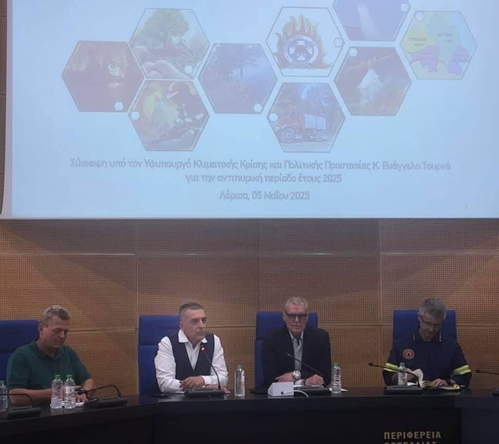 Ευρεία σύσκεψη υπό τον Υφυπουργό Κλιματικής Κρίσης και Πολιτικής Προστασίας, Ευάγγελο Τουρνά, πραγματοποιήθηκε χθες, Δευτέρα 05 Μαΐου 2025, στη Λάρισα για την προετοιμασία της αντιπυρικής περιόδου στην Περιφέρεια Θεσσαλίας.