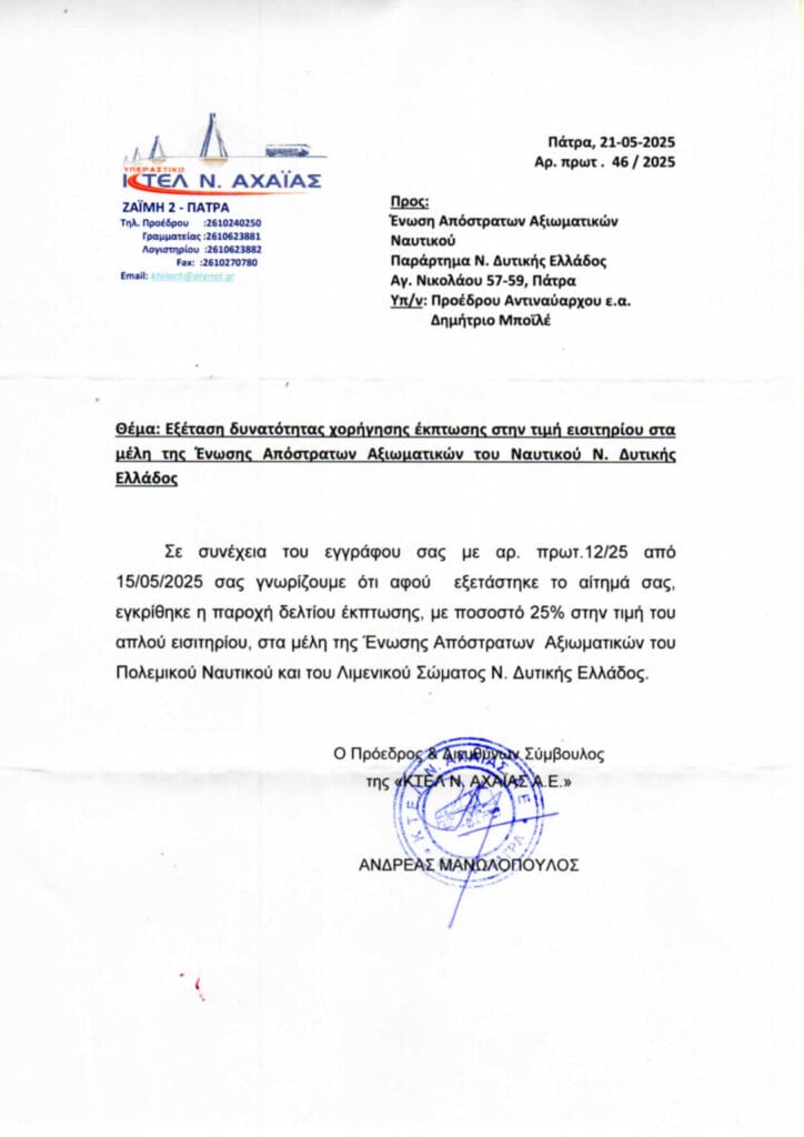 Ευχαρίστως ενημερώνουμε τα Μέλη μας του Νομού Αχαΐας, ότι με ενέργειες Του Προέδρου του Παραρτήματός μας στη ΝΔ Ελλάδα (Πάτρα) επιτεύχθηκε μείωση της τιμής εισιτηρίου ΚΤΕΛ Ν. Αχαΐας όπως παρακάτω.