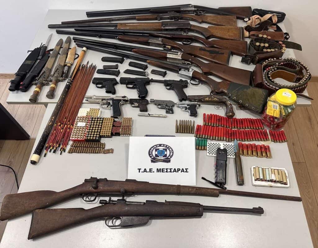 Συνελήφθησαν χθες (25.07.2025) το πρωί σε περιοχή του Δήμου Φαιστού από αστυνομικούς του Τμήματος Αστυνομικών Επιχειρήσεων Μεσσαράς δύο ημεδαποί ηλικίας 67 και 29 ετών κατηγορούμενοι για παραβάσεις νομοθεσίας περί όπλων.