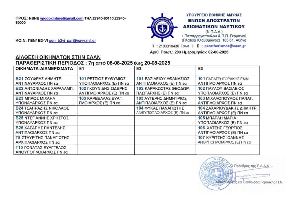 Ελλάδα Κατανομή Οικημάτων 7ης Παραθεριστικής Περιόδου ΘΑΝ από 08-08 έως 20-08-2025 Ελλάδα Κατανομή Οικημάτων 7ης Παραθεριστικής Περιόδου ΘΑΝ από 08-08 έως 20-08-2025 05/08/2025 FacebookTwitterWhatsAppEmailΤυπώνωTelegramViber ΣΤΗΝ ΙΔΙΑ ΚΑΤΗΓΟΡΙΑΠΕΡΙΣΣΟΤΕΡΑ... Ελλάδα Μακεδονία: Νεαρός άνδρας οδηγούσε τα ξημερώματα με 179χλμ/ώρα και συνελήφθη Ελλάδα Χανιά: Δέκα συλλήψεις μετά από καταγγελία ανήλικης για ομαδικό βιασμό Ελλάδα Διακινητής μετέφερε οκτώ μετανάστες στο ρυμουλκούμενο του οχήματός του ΔΙΑΒΑΣΤΕ ΕΠΙΣΗΣ Πρώτες βοήθειες σε τροχαία ατυχήματα 17/03/2026 Λασίθι: Με τρία νέα οχήματα ενισχύεται το Λιμεναρχείο Αγίου Νικολάου –... 16/03/2026 Μακεδονία: Νεαρός άνδρας οδηγούσε τα ξημερώματα με 179χλμ/ώρα και συνελήφθη 16/03/2026 FT: Υπουργοί της ΕΕ θα συζητήσουν τη διεύρυνση της αποστολής «Ασπίδες»... 16/03/2026 Χανιά: Δέκα συλλήψεις μετά από καταγγελία ανήλικης για ομαδικό βιασμό 16/03/2026 Β. Κικίλιας: «Θα κάνουμε ό,τι μπορούμε για τους Έλληνες ως προς... 16/03/2026 Διακινητής μετέφερε οκτώ μετανάστες στο ρυμουλκούμενο του οχήματός του 16/03/2026 Δολοφονία 20χρονου στην Καλαμαριά – Συμπληρωματική δίωξη στα δύο άτομα που... 16/03/2026 Νεκρός εντοπίστηκε αγνοούμενος ηλικιωμένος ψαράς, σε βραχώδη περιοχή κοντά στη Λίνδο 16/03/2026 Πυροσβέστες Νομού Ηρακλείου: Συνάντηση αντιπροσωπείας 8 συνεργαζόμενων Σωματείων με τον Αντιστράτηγο... 16/03/2026
