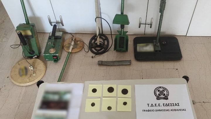Ειδικότερα βρέθηκαν -μεταξύ άλλων- και κατασχέθηκαν 6 νομίσματα διαφόρων ιστορικών περιόδων, 21 φυσίγγια, εκ των οποίων τα 11 αβολίδωτα, 3 ανιχνευτές μετάλλων, 4 μεταλλικές ράβδοι εδάφους και 1 πολλαπλασιαστής βάθους.