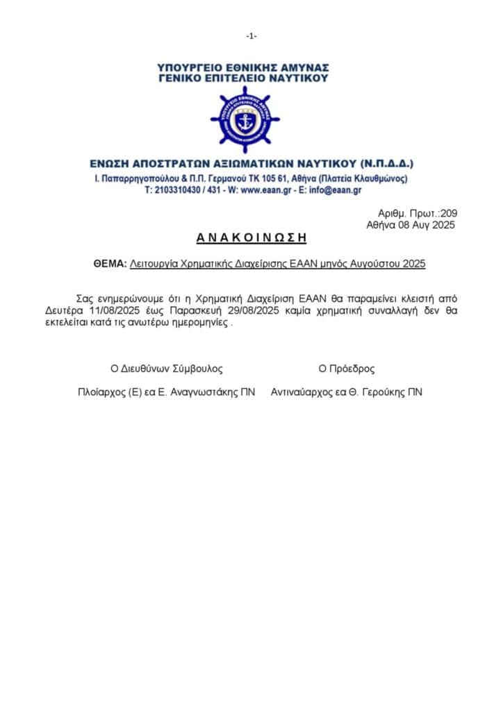 Ελλάδα Λειτουργία Χρηματικής Διαχείρισης ΕΑΑΝ τον Αύγουστο Ελλάδα Λειτουργία Χρηματικής Διαχείρισης ΕΑΑΝ τον Αύγουστο 12/08/2025 FacebookTwitterWhatsAppEmailΤυπώνωTelegramViber ΣΤΗΝ ΙΔΙΑ ΚΑΤΗΓΟΡΙΑΠΕΡΙΣΣΟΤΕΡΑ... Ελλάδα Μακεδονία: Νεαρός άνδρας οδηγούσε τα ξημερώματα με 179χλμ/ώρα και συνελήφθη Ελλάδα Χανιά: Δέκα συλλήψεις μετά από καταγγελία ανήλικης για ομαδικό βιασμό Ελλάδα Διακινητής μετέφερε οκτώ μετανάστες στο ρυμουλκούμενο του οχήματός του ΔΙΑΒΑΣΤΕ ΕΠΙΣΗΣ Πρώτες βοήθειες σε τροχαία ατυχήματα 17/03/2026 Λασίθι: Με τρία νέα οχήματα ενισχύεται το Λιμεναρχείο Αγίου Νικολάου –... 16/03/2026 Μακεδονία: Νεαρός άνδρας οδηγούσε τα ξημερώματα με 179χλμ/ώρα και συνελήφθη 16/03/2026 FT: Υπουργοί της ΕΕ θα συζητήσουν τη διεύρυνση της αποστολής «Ασπίδες»... 16/03/2026 Χανιά: Δέκα συλλήψεις μετά από καταγγελία ανήλικης για ομαδικό βιασμό 16/03/2026 Β. Κικίλιας: «Θα κάνουμε ό,τι μπορούμε για τους Έλληνες ως προς... 16/03/2026 Διακινητής μετέφερε οκτώ μετανάστες στο ρυμουλκούμενο του οχήματός του 16/03/2026 Δολοφονία 20χρονου στην Καλαμαριά – Συμπληρωματική δίωξη στα δύο άτομα που... 16/03/2026 Νεκρός εντοπίστηκε αγνοούμενος ηλικιωμένος ψαράς, σε βραχώδη περιοχή κοντά στη Λίνδο 16/03/2026 Πυροσβέστες Νομού Ηρακλείου: Συνάντηση αντιπροσωπείας 8 συνεργαζόμενων Σωματείων με τον Αντιστράτηγο... 16/03/2026