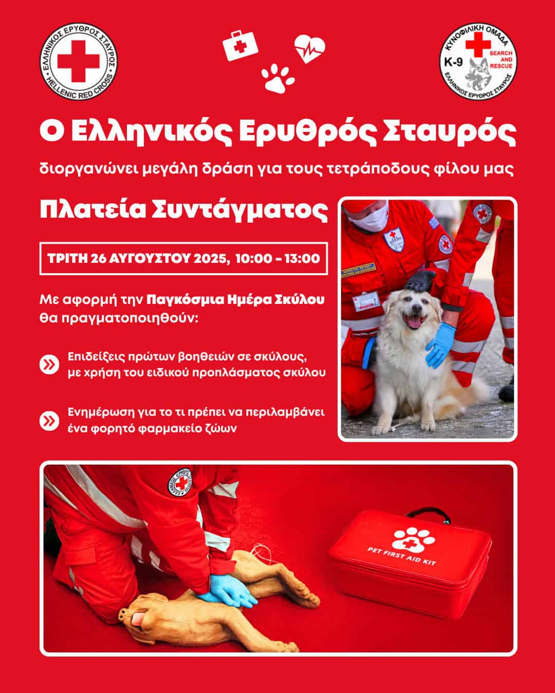 Ο Ελληνικός Ερυθρός Σταυρός (Ε.Ε.Σ), με αφορμή την Παγκόσμια Ημέρα σκύλου (26/8), διοργανώνει μεγάλη δράση την Τρίτη (26/8) και ώρες 10:00 – 13:00, στην Πλατεία Συντάγματος (πλησίον σταθμού Μετρό), με στόχο την εξοικείωση του κοινού με τις Πρώτες Βοήθειες για σκύλους. Το πρωτοποριακό, καινοτόμο πρόγραμμα εκπαίδευσης Πρώτων Βοηθειών για σκύλους που υλοποιεί ο Ε.Ε.Σ. σε όλη την Ελλάδα.