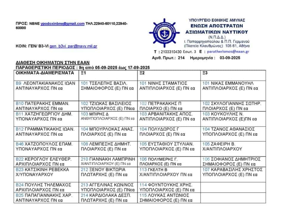 Ελλάδα Κατανομή Οικημάτων 9ης Παραθεριστικής Περιόδου ΘΑΝ από 05-09 έως 17-09-2025 Ελλάδα Κατανομή Οικημάτων 9ης Παραθεριστικής Περιόδου ΘΑΝ από 05-09 έως 17-09-2025 04/09/2025 FacebookTwitterWhatsAppEmailΤυπώνωTelegramViber ΣΤΗΝ ΙΔΙΑ ΚΑΤΗΓΟΡΙΑΠΕΡΙΣΣΟΤΕΡΑ... Ελλάδα Μακεδονία: Νεαρός άνδρας οδηγούσε τα ξημερώματα με 179χλμ/ώρα και συνελήφθη Ελλάδα Χανιά: Δέκα συλλήψεις μετά από καταγγελία ανήλικης για ομαδικό βιασμό Ελλάδα Διακινητής μετέφερε οκτώ μετανάστες στο ρυμουλκούμενο του οχήματός του ΔΙΑΒΑΣΤΕ ΕΠΙΣΗΣ Πρώτες βοήθειες σε τροχαία ατυχήματα 17/03/2026 Λασίθι: Με τρία νέα οχήματα ενισχύεται το Λιμεναρχείο Αγίου Νικολάου –... 16/03/2026 Μακεδονία: Νεαρός άνδρας οδηγούσε τα ξημερώματα με 179χλμ/ώρα και συνελήφθη 16/03/2026 FT: Υπουργοί της ΕΕ θα συζητήσουν τη διεύρυνση της αποστολής «Ασπίδες»... 16/03/2026 Χανιά: Δέκα συλλήψεις μετά από καταγγελία ανήλικης για ομαδικό βιασμό 16/03/2026 Β. Κικίλιας: «Θα κάνουμε ό,τι μπορούμε για τους Έλληνες ως προς... 16/03/2026 Διακινητής μετέφερε οκτώ μετανάστες στο ρυμουλκούμενο του οχήματός του 16/03/2026 Δολοφονία 20χρονου στην Καλαμαριά – Συμπληρωματική δίωξη στα δύο άτομα που... 16/03/2026 Νεκρός εντοπίστηκε αγνοούμενος ηλικιωμένος ψαράς, σε βραχώδη περιοχή κοντά στη Λίνδο 16/03/2026 Πυροσβέστες Νομού Ηρακλείου: Συνάντηση αντιπροσωπείας 8 συνεργαζόμενων Σωματείων με τον Αντιστράτηγο... 16/03/2026
