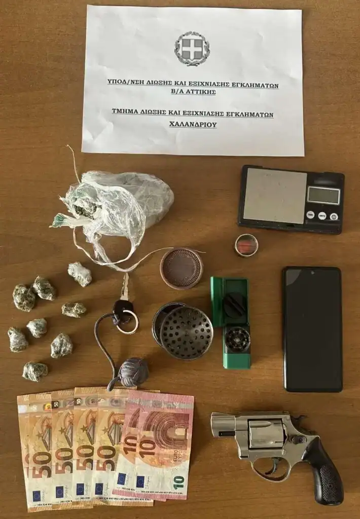 Συνελήφθη από αστυνομικούς της Ο.Π.Κ.Ε., απογευματινές ώρες της 17-10-2025 στην περιοχή του Χαλανδρίου, 23χρονος ημεδαπός, κατηγορούμενος για παράβαση της νομοθεσίας περί εξαρτησιογόνων ουσιών, περί όπλων, καθώς και για στέρηση άδειας ικανότητας οδήγησης.