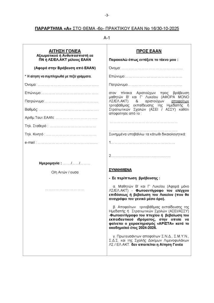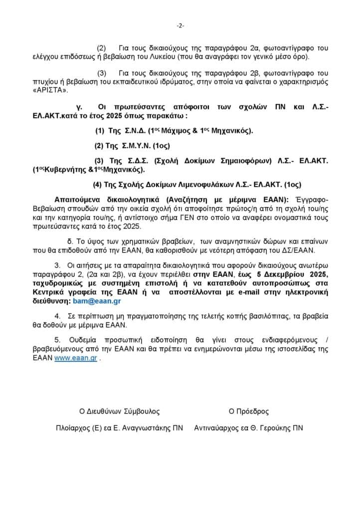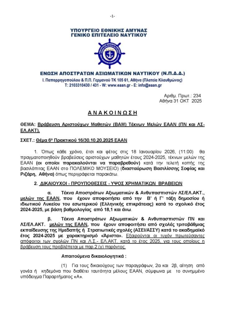 Ελλάδα Βράβευση Αριστούχων Μαθητών (ΒΑΜ) Τέκνων Μελών ΕΑΑΝ (ΠΝ και ΛΣ-ΕΛ.ΑΚΤ) από ΕΑΑΝ
