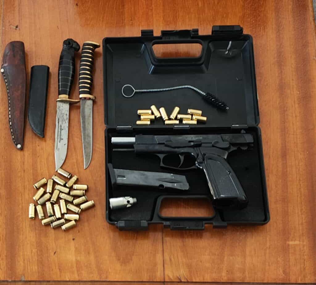 Από αστυνομικούς της Υποδιεύθυνσης Δίωξης και Εξιχνίασης Εγκλημάτων Αγίου Νικολάου και του Τμήματος Αστυνομικών Επιχειρήσεων Λασιθίου πραγματοποιήθηκε έρευνα στην οικία και το όχημα του 29χρονου και σε περιβάλλοντες χώρους κατά τη διάρκεια της οποίας βρέθηκαν και κατασχέθηκαν πιστόλι με γεμιστήρα και 11 φυσίγγια, 24 κάλυκες και 2 μαχαίρια.