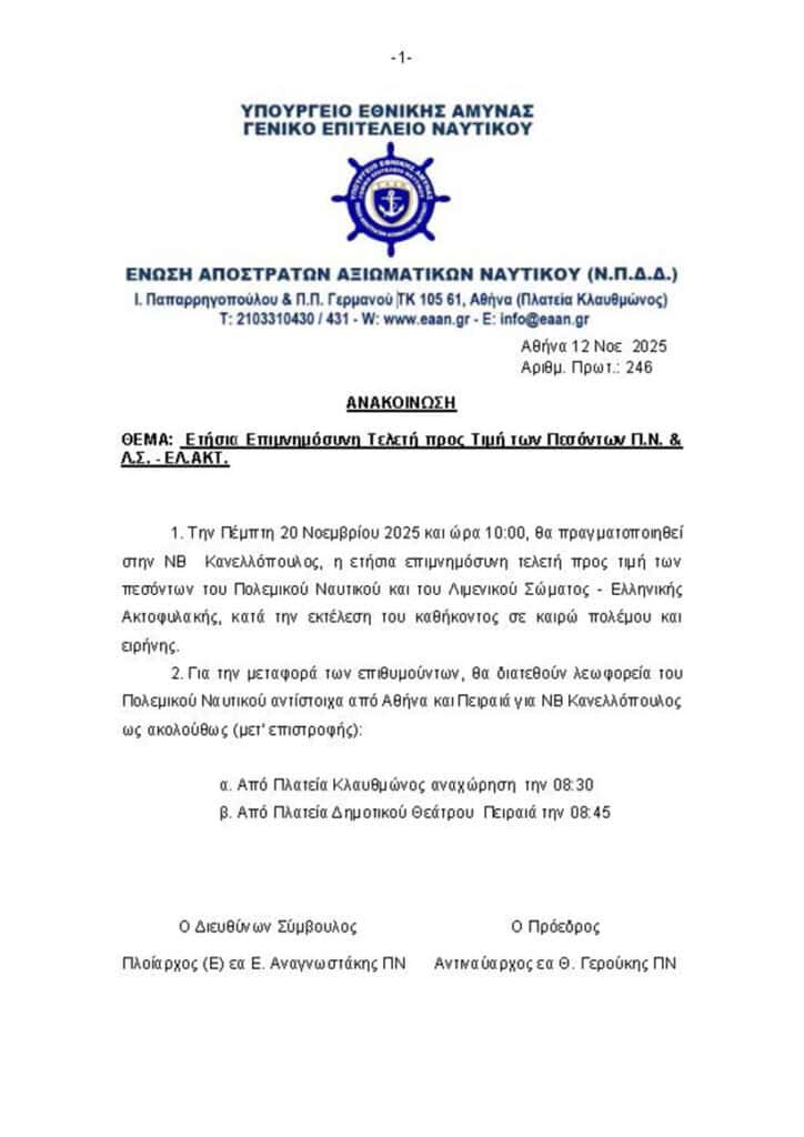 Ελλάδα Ετήσιο Μνημόσυνο προς Τιμή των Πεσόντων ΠΝ & ΛΣ-ΕΛ.ΑΚΤ στη ΝΒ Κανελλόπουλος