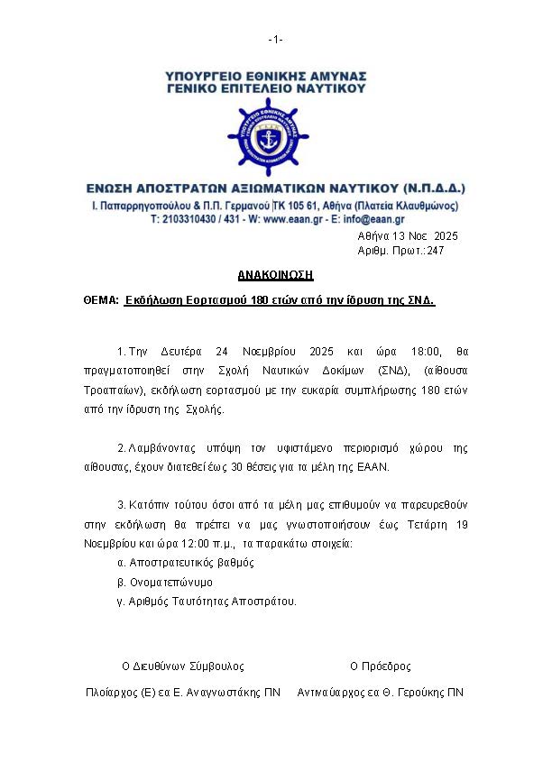 Εκδήλωση Εορτασμού 180 ετών από την ίδρυση της ΣΝΔ