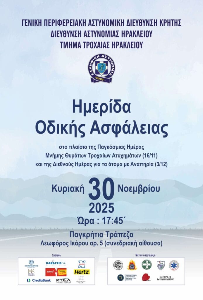 Την Κυριακή 30 Νοεμβρίου 2025 και ώρα 17:45΄ στη συνεδριακή αίθουσα της Παγκρήτιας Τράπεζας (CrediaBank) – Λεωφόρο Ικάρου 5, το Τμήμα Τροχαίας Ηρακλείου διοργανώνει Ημερίδα Οδικής Ασφάλειας στο πλαίσιο της Παγκόσμιας Ημέρας Μνήμης Θυμάτων Τροχαίων Ατυχημάτων (16/11) και της Διεθνούς Ημέρας για τα άτομα με Αναπηρία (3/12).