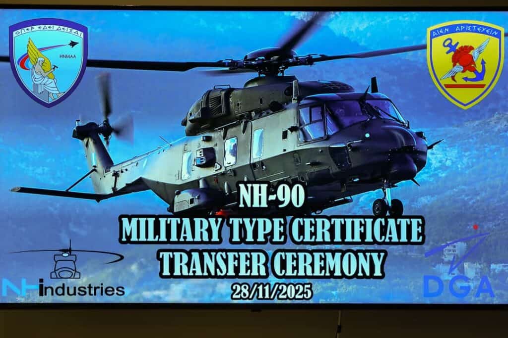 Την Παρασκευή 28 Νοεμβρίου 2025 έλαβε χώρα η τελετή απονομής Πιστοποιητικού Στρατιωτικού Τύπου (Military Type Certificate, MTC) στα ελικόπτερα ΝΗ – 90, στις εγκαταστάσεις της Εθνικής Στρατιωτικής Αρχής Αξιοπλοΐας (ΕΣΑΑ), παρουσία του Αρχηγού ΓΕΕΘΑ Στρατηγού Δημητρίου Χούπη.