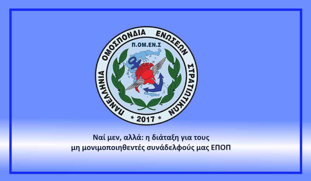 - Η Πανελλήνια Ομοσπονδία Ενώσεων Στρατιωτικών – ΠΟΜΕΝΣ, σε συνέχεια της ψήφισης του πρόσφατου πολυνομοσχεδίου του Υπουργείου Εθνικής Άμυνας και ειδικότερα του άρθρου 303, με το οποίο προστίθεται η παράγραφος 6Α στο άρθρο 5 του ν. 3883/2010, προβαίνει σε θεσμική τοποθέτηση επί της νέας ρύθμισης για τη συνυπηρέτηση στρατιωτικών με μη μονιμοποιημένους ΕΠΟΠ.