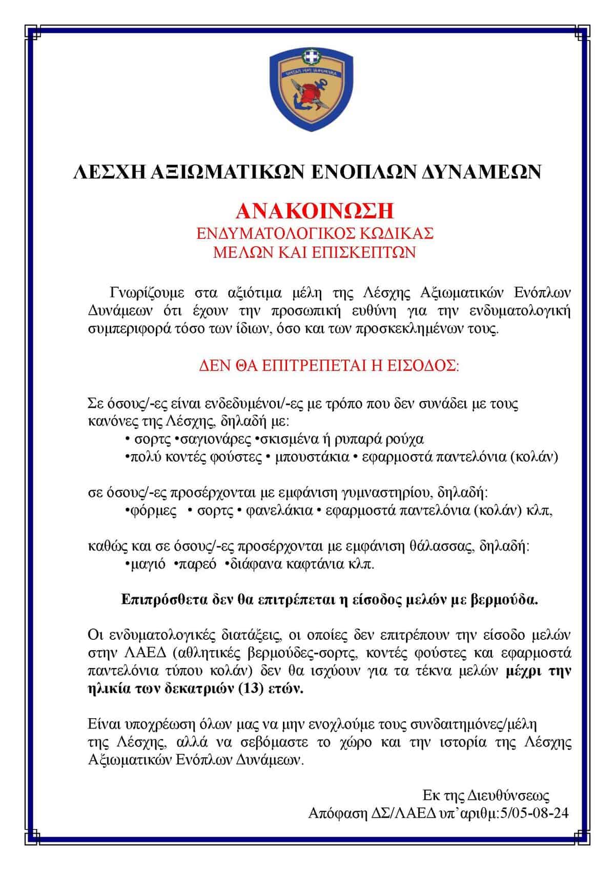 Σώματα Ασφαλείας Ενοπλες Δυνάμεις ΛΑΕΔ – Ενδυματολογικός κώδικας μελών και επισκεπτών Σώματα ΑσφαλείαςΕνοπλες Δυνάμεις ΛΑΕΔ – Ενδυματολογικός κώδικας μελών και επισκεπτών 02/03/2026 FacebookTwitterWhatsAppEmailΤυπώνωTelegramViber ΣΤΗΝ ΙΔΙΑ ΚΑΤΗΓΟΡΙΑΠΕΡΙΣΣΟΤΕΡΑ... Ενοπλες Δυνάμεις Επίσκεψη Υπουργού Εθνικής Άμυνας Ν. Δένδια στο Ηνωμένο Βασίλειο Ενοπλες Δυνάμεις Συνοδεία Θανάση Δαβάκη η επίσκεψη του Κυριάκου Μητσοτάκη στην 110 Πτέρυγα Μάχης στη Λάρισα Ενοπλες Δυνάμεις Παράταση στην διεκδίκηση της νυχτερινής αποζημίωσης ΔΙΑΒΑΣΤΕ ΕΠΙΣΗΣ Πρώτες βοήθειες σε τροχαία ατυχήματα 17/03/2026 Λασίθι: Με τρία νέα οχήματα ενισχύεται το Λιμεναρχείο Αγίου Νικολάου –... 16/03/2026 Μακεδονία: Νεαρός άνδρας οδηγούσε τα ξημερώματα με 179χλμ/ώρα και συνελήφθη 16/03/2026 FT: Υπουργοί της ΕΕ θα συζητήσουν τη διεύρυνση της αποστολής «Ασπίδες»... 16/03/2026 Χανιά: Δέκα συλλήψεις μετά από καταγγελία ανήλικης για ομαδικό βιασμό 16/03/2026 Β. Κικίλιας: «Θα κάνουμε ό,τι μπορούμε για τους Έλληνες ως προς... 16/03/2026 Διακινητής μετέφερε οκτώ μετανάστες στο ρυμουλκούμενο του οχήματός του 16/03/2026 Δολοφονία 20χρονου στην Καλαμαριά – Συμπληρωματική δίωξη στα δύο άτομα που... 16/03/2026 Νεκρός εντοπίστηκε αγνοούμενος ηλικιωμένος ψαράς, σε βραχώδη περιοχή κοντά στη Λίνδο 16/03/2026 Πυροσβέστες Νομού Ηρακλείου: Συνάντηση αντιπροσωπείας 8 συνεργαζόμενων Σωματείων με τον Αντιστράτηγο... 16/03/2026