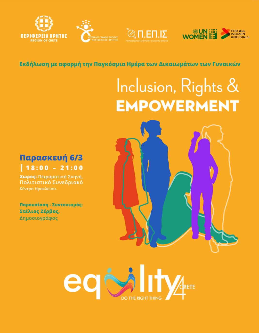 Η Περιφέρεια Κρήτης, Αυτοτελές Γραφείο Ισότητας Περιφέρειας Κρήτης και Περιφερειακή Επιτροπή Ισότητας των Φύλων (Π.ΕΠ.ΙΣ.) Κρήτης διοργανώνουν εκδήλωση ενημέρωσης και ευαισθητοποίησης, με αφορμή την «Παγκόσμια Ημέρα των Δικαιωμάτων των Γυναικών», η οποία εορτάζεται κάθε χρόνο στις 8 Μαρτίου σε όλο τον κόσμο, με σκοπό την ανάδειξη των αγώνων των γυναικών για δικαιοσύνη, ελευθερία και αξιοπρέπεια, αλλά και ως υπενθύμιση ότι η έμφυλη ισότητα παραμένει ζητούμενο και συλλογική ευθύνη των σύγχρονων κοινωνιών.