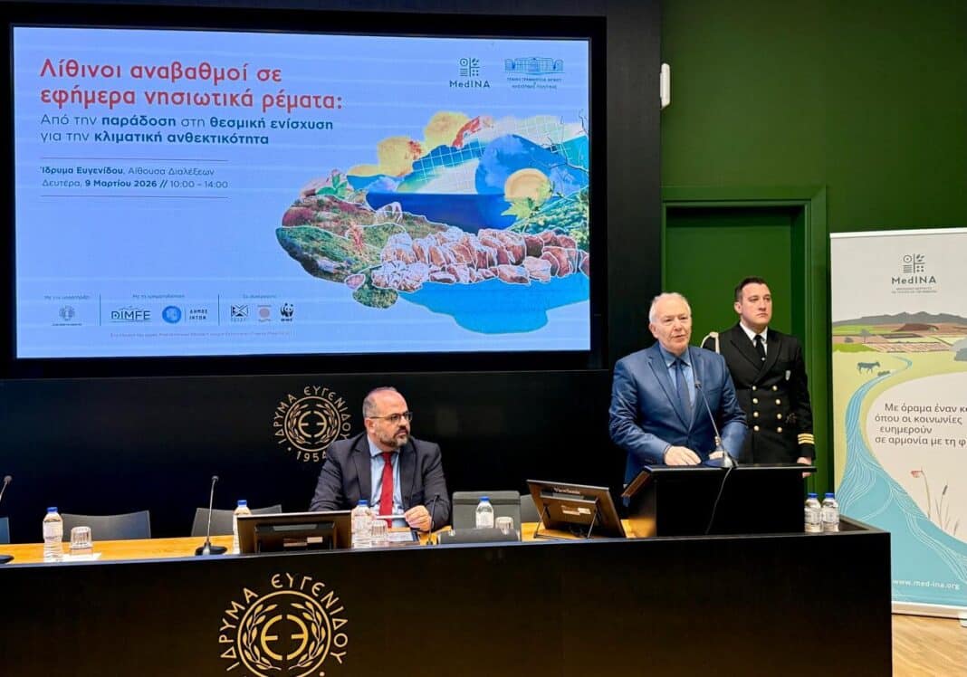Τα πολλαπλά οφέλη και την αναγκαιότητα διατήρησης, προστασίας και κυρίως επαναφοράς των παραδοσιακών και διαχρονικών πρακτικών των νησιωτών μας, όσον αφορά στην διαχείριση των υδάτινων πόρων, με στόχο τον εμπλουτισμό του υδροφόρου ορίζοντα, τη μείωση του κινδύνου πλημμύρας και ξηρασίας, αλλά και την ενίσχυση της βιοποικιλότητας και της ανθεκτικότητας των νησιών μας, ανέδειξε η Ημερίδα “Λίθινοι αναβαθµοί σε εφήµερα νησιωτικά ρέµατα: Από την παράδοση στη θεσμική ενίσχυση για την κλιματική ανθεκτικότητα”, τις εργασίες της οποίας κήρυξε στο ίδρυμα Ευγενίδου, ο Υφυπουργός Ναυτιλίας και Νησιωτικής Πολιτικής, Στέφανος Γκίκας.
