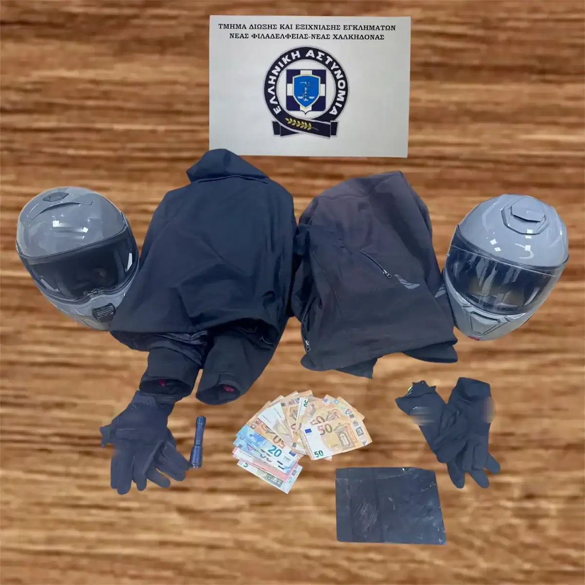 Από έρευνες που πραγματοποιήθηκαν στις οικίες των κατηγορουμένων βρέθηκαν, και κατασχέθηκαν κράνη και ρουχισμός που είχαν χρησιμοποιήσει κατά την τέλεση των αξιόποινων πράξεων.
