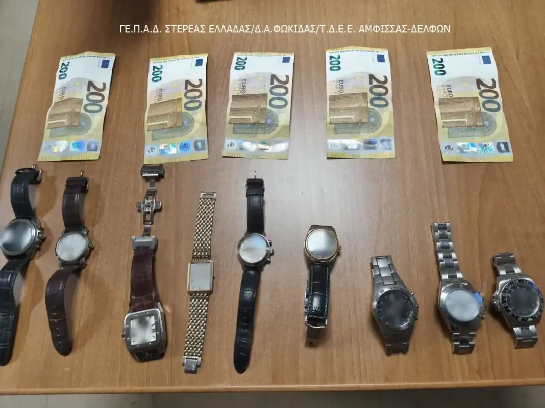 Από τους αστυνομικούς εντοπίστηκε μία συσκευασία, επιμελώς κρυμμένη στη βάση ελαιόδεντρου σε αγροτεμάχιο περιοχής της Άμφισσας, εντός της οποίας βρέθηκαν & κατασχέθηκαν συνολικά εννέα κλεμμένα ρολόγια, τα οποία αποδόθηκαν στον νόμιμο κάτοχό τους, καθώς και το χρηματικό ποσό των 1.000  ευρώ, προερχόμενο από την πώληση ενός ακόμη κλεμμένου ρολογιού σε περιοχή της Αττικής.