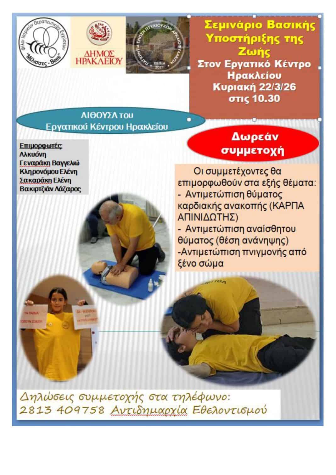 Σεμινάριο Βασικής Υποστήριξης της Ζωής με ελεύθερη συμμετοχή διοργανώνουν η Αντιδημαρχία Εθελοντισμού του Δήμου Ηρακλείου και οι «Φίλοι Ιατρικών Θεραπευτικών Εντόμων – Μέλισσες» την Κυριακή 22 Μαρτίου στις 10:30 στην αίθουσα του Εργατικού Κέντρου Ηρακλείου για την Παγκρήτια Ένωση Πτυχιούχων Αρχαιοφυλάκων.