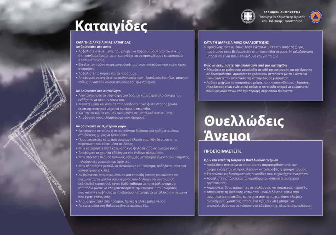 Παράλληλα, η Γενική Γραμματεία Πολιτικής Προστασίας συνιστά στους πολίτες να είναι ιδιαίτερα προσεκτικοί, μεριμνώντας για τη λήψη μέτρων αυτοπροστασίας από κινδύνους που προέρχονται από την εκδήλωση των έντονων καιρικών φαινομένων.
