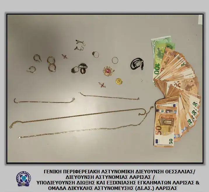 Ως προς το ιστορικό, μεσημβρινές ώρες προχθές στην πόλη της Λάρισας, αστυνομικοί της Ομάδας Δίκυκλης Αστυνόμευσης (ΔΙ.ΑΣ.) Λάρισας προέβησαν σε έλεγχο Ι.Χ.Ε. αυτοκινήτου, στο οποίο επέβαιναν οι δύο συλληφθέντες και το οποίο ήταν μισθωμένο από τον άλλον ημεδαπό άνδρα που αναζητείται. Κατά τον έλεγχο βρέθηκαν, επιμελώς κρυμμένα, στο εσωτερικό του οχήματος, το χρηματικό ποσό των 3.650 ευρώ καθώς και διάφορα κοσμήματα (αλυσίδες, δαχτυλίδια κ.λπ.).